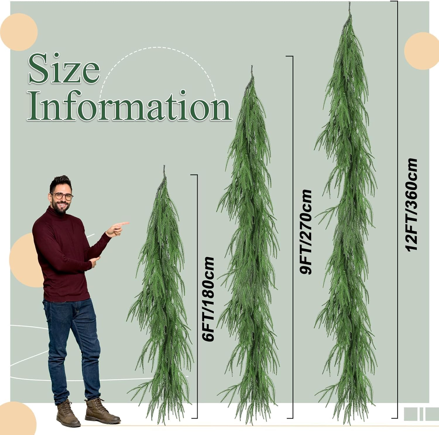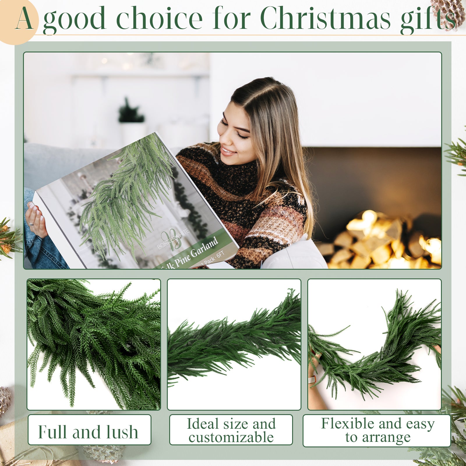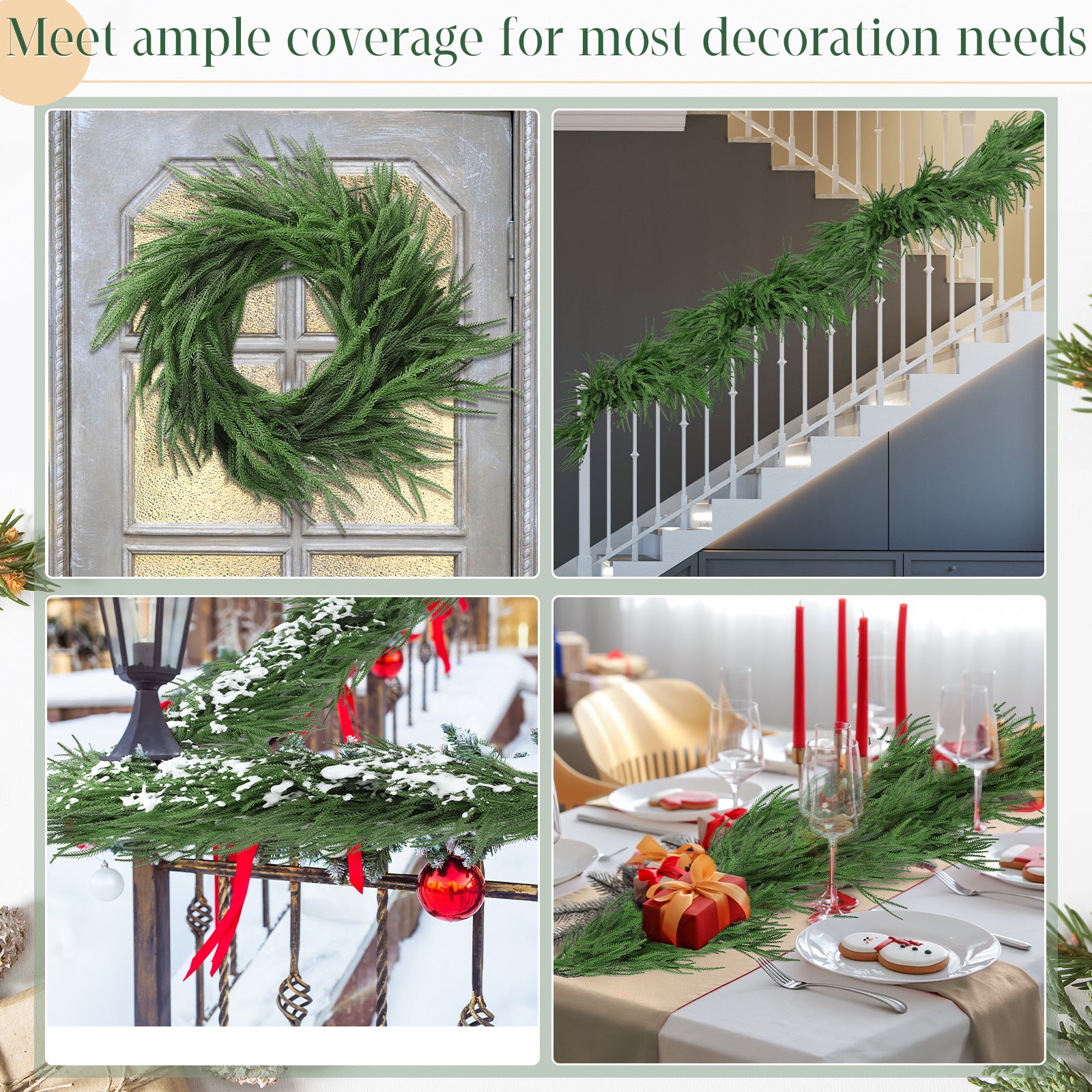 - QUANTITY AND SIZE: scented Norfolk garland comes with a exquisite gift box, is long about 6 feet (1.8 meters), enough to cover your 10 guests table, allowing to hang front door, mantle, fireplaces, stairs.