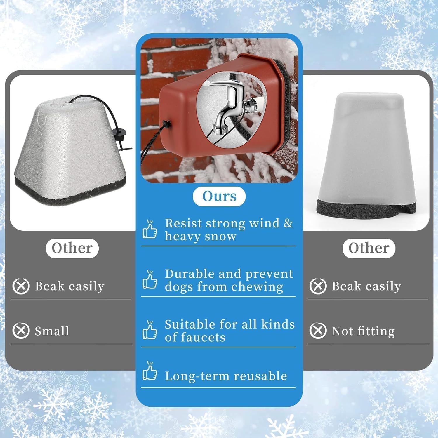 - Effective Freeze Protection: The thick characteristics of the outside faucet cover gives them an edge over normal products, providing better protection against frost, wind, and cold. Outdoor pet proof spigot covers are designed to help your faucet withstand harsh weather, ensuring it functions effectively even in freezing conditions. In addition, the robust plastic shell not only ensures long-lasting use but also prevents dogs from chewing through the faucet cover.